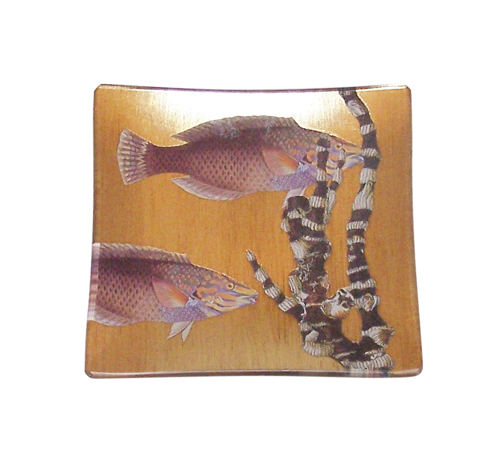 Exotic Fish and Black Coral are the basis for his diminutive 4″ square tray that is very elegant with its gold gilded background. Designed and created by Scott Potter, this piece is wonderful as a desk tray or decorative accent. It is created with finely cut nautical images that are placed under the glass and combined with the many layers of gold gilding. It is finished on the back with a handmade paper and sealed for handwashing. Hand signed by Scott Potter. Alternate background colorations of either silver or white may also be requested. Additional dimensions are available: 6″ square, 8″ square, 10″ square, 12″ square, and 16″ square. For more information, contact the Scott Potter studio: (207) 775-3630.
