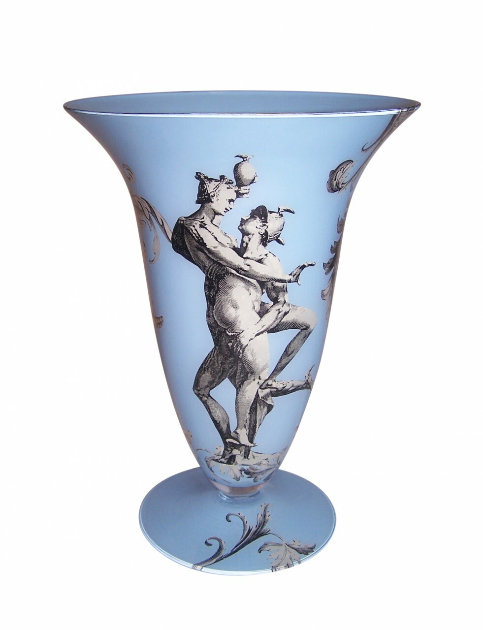 Reproductions of finely drawn Renaissance images in black and white have been carefully handcut and placed under the glass in Scott Potter’s elegant interpretation of classical myths. Mercury and Psyche embrace in three different prints and combine with many layers of blue glaze on this 10″ high vase. Hand signed by Scott Potter. Alternate background colorations of either silver or white may also be requested. For custom orders, contact the Scott Potter studio: (207) 775-3630.