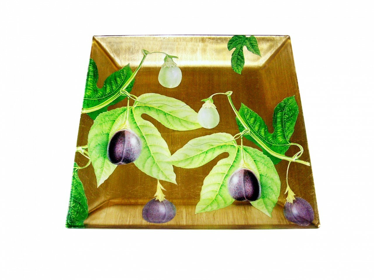 Dramatic prints of Passion Fruit embellish this elegant 10″ square plate. It has been created with finely handcut papercuttings placed under the glass and then combined with many layers of gold gilding. The back is finished in a handmade paper and then carefully sealed for handwashing. Hand signed by Scott Potter. This versatile piece is both a decorative accent as well as beautiful servingware. Alternate background colorations of either silver or white may also be requested.