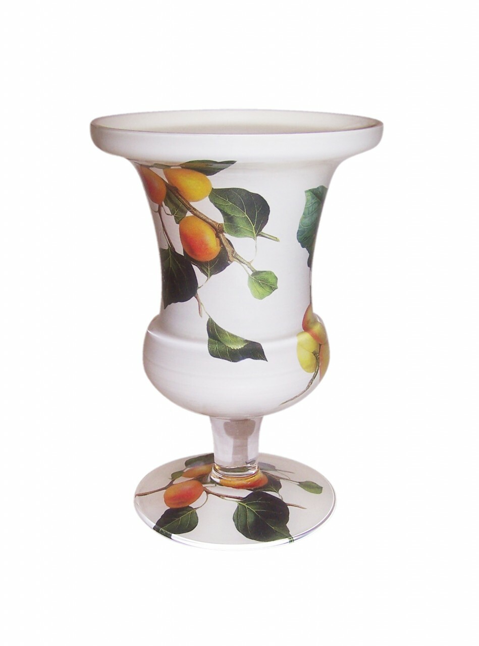 This dimutive classical urn on a pedestal has been created with finely handcut reproduction prints of Peaches combined under glass with white glaze. Designed by Scott Potter for the Fall/ Holiday season, this handsome combination of prints is a charming accent piece for the home. Alternate background colorations of either silver or gold may also be requested. All design patterns on the website are available for this 8″ urn as a custom order through the Scott Potter studio. Hand signed by Scott Potter. For live floral arrangements, use with a glass or plastic liner.