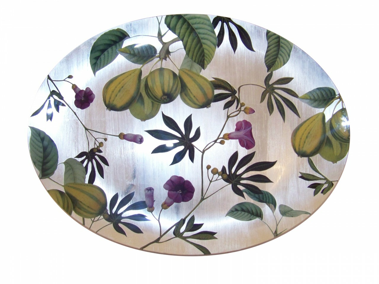 Elegant and dramatic, this large oval tray is embellished with prints of Striped Pears and Purple Morninglories. Hand cut papers have been combined with many layers of silver gilding in a dramatic collage designed and created by Scott Potter. Versatile as both a serving tray or a decorative accent, the back is finished with a handmade paper that has been carefully sealed. Hand signed by Scott Potter. Hand wash.